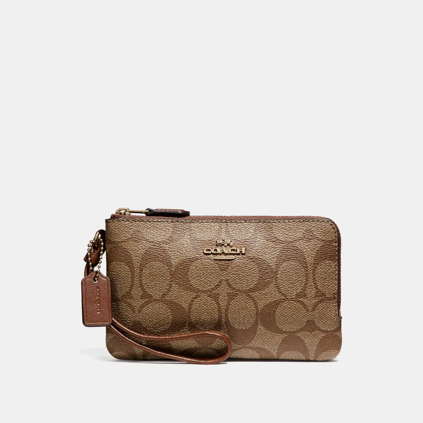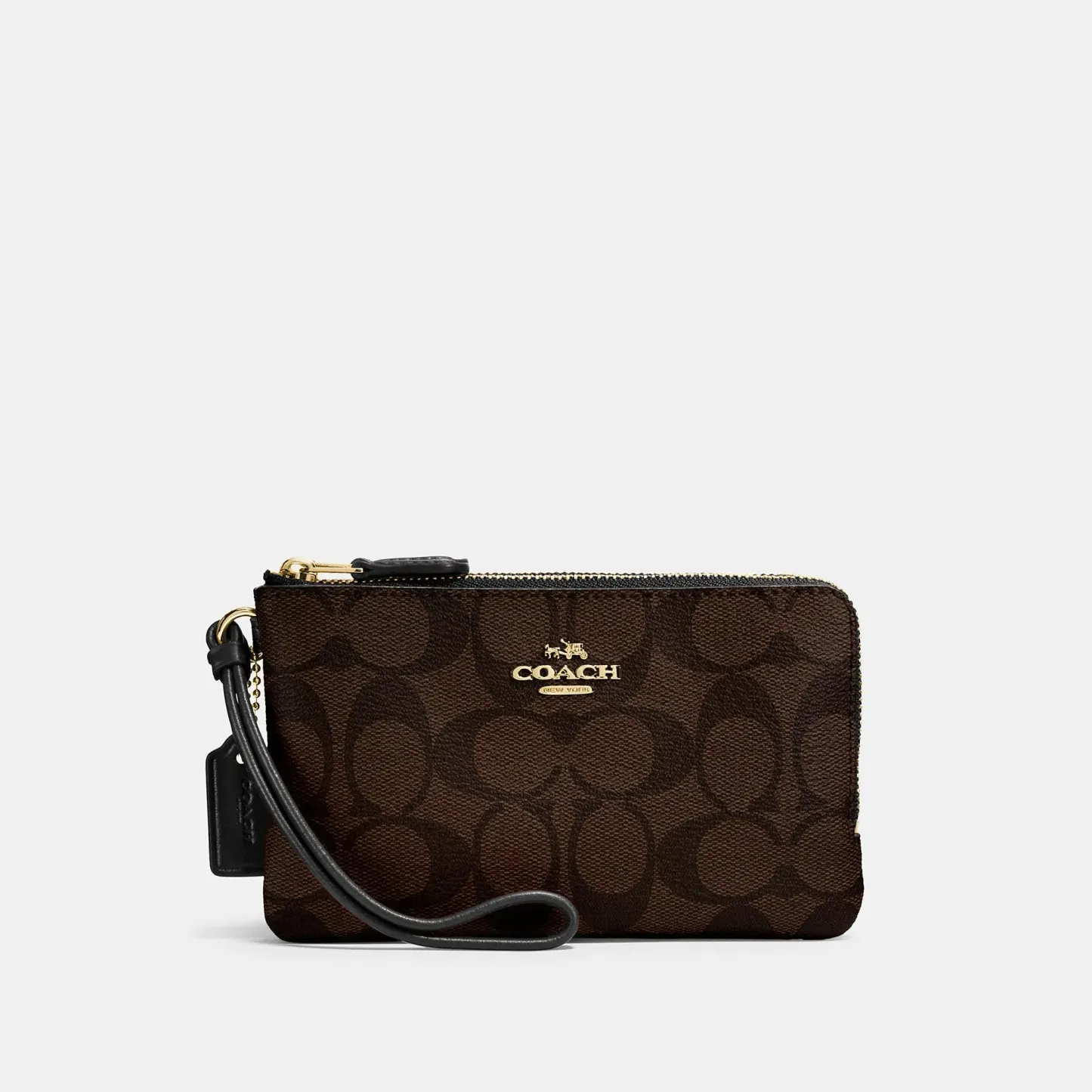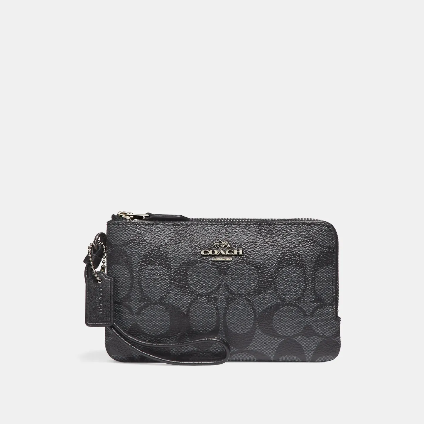 Signature coated canvas Two credit card slots Double zip closure fabric lining Wrist strap attached 6 1/2 (L) x 3 3/4 (H) Fits an iPhone or Android Style No. F87591