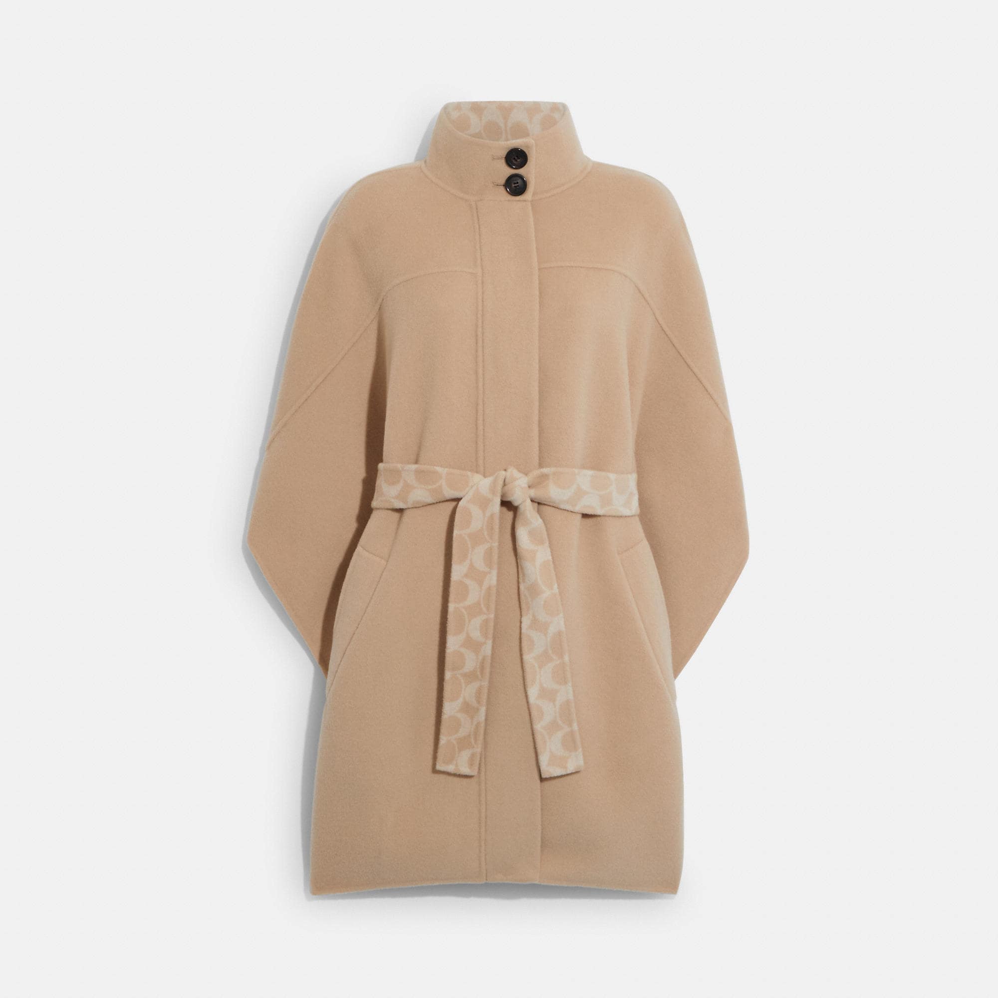 56% wool 26% viscose 16% polyamide 2% other fibers Zip and snap button closures Slip pockets Self-tie belt Length - 38 1/2 Model is 5'10 (178cm) chest 31 (79cm) waist 24 (61cm) hips 35 (89cm) and wears a size S Style No. CA489 | Outlet Double Face Wool Cape - Beige, Size - X-Small/Small